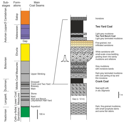 the Two Yard Coal (Duckmantian / Westphalian C). The Brymbo Fossil Forest exposure shows the uppermost 14 meters of the Coal Measures which are associated with two coal seams, the Crank Coal at the bottom of the exposed section and the Two Yard Coal at the top.